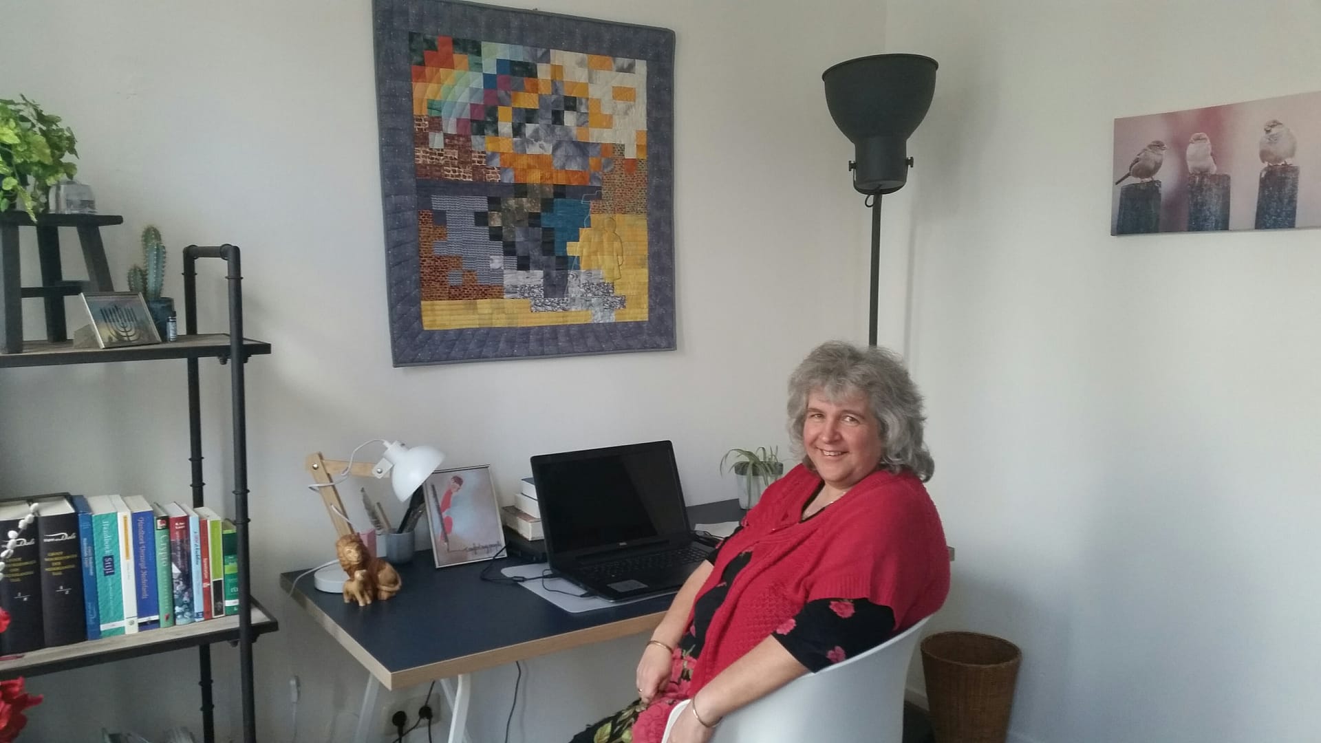 Marianne laat me haar prachtige schrijfkamer zien. De kamer is voor haar echt een plekje waar ze in alle rust kan schrijven. Boven haar bureau hangt een quilt, een levensquilt, gemaakt door haar zus Rieteke Hoogendoorn (www.bijbelquilts.nl) Als je goed kijkt, zie je rechtsonder twee mensen, degene met de witte lijn is de persoon van Jezus, die onzichtbaar aanwezig is. In de linkerbovenhoek zie je de regenboogkleuren.